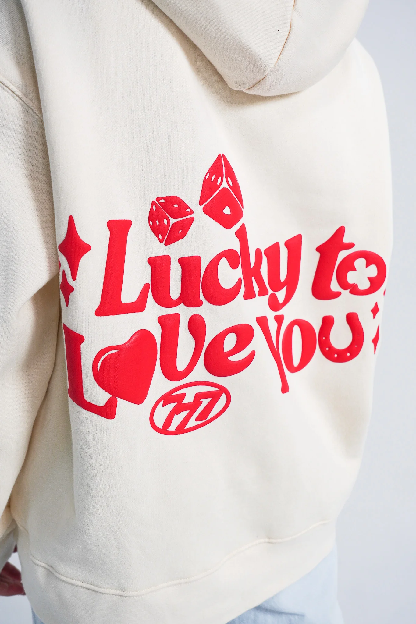 - Lucky to Love You puff paint design on the back, 777 puff paint detail on the right shoulder, and Heart dice embroidery on the front left chest
