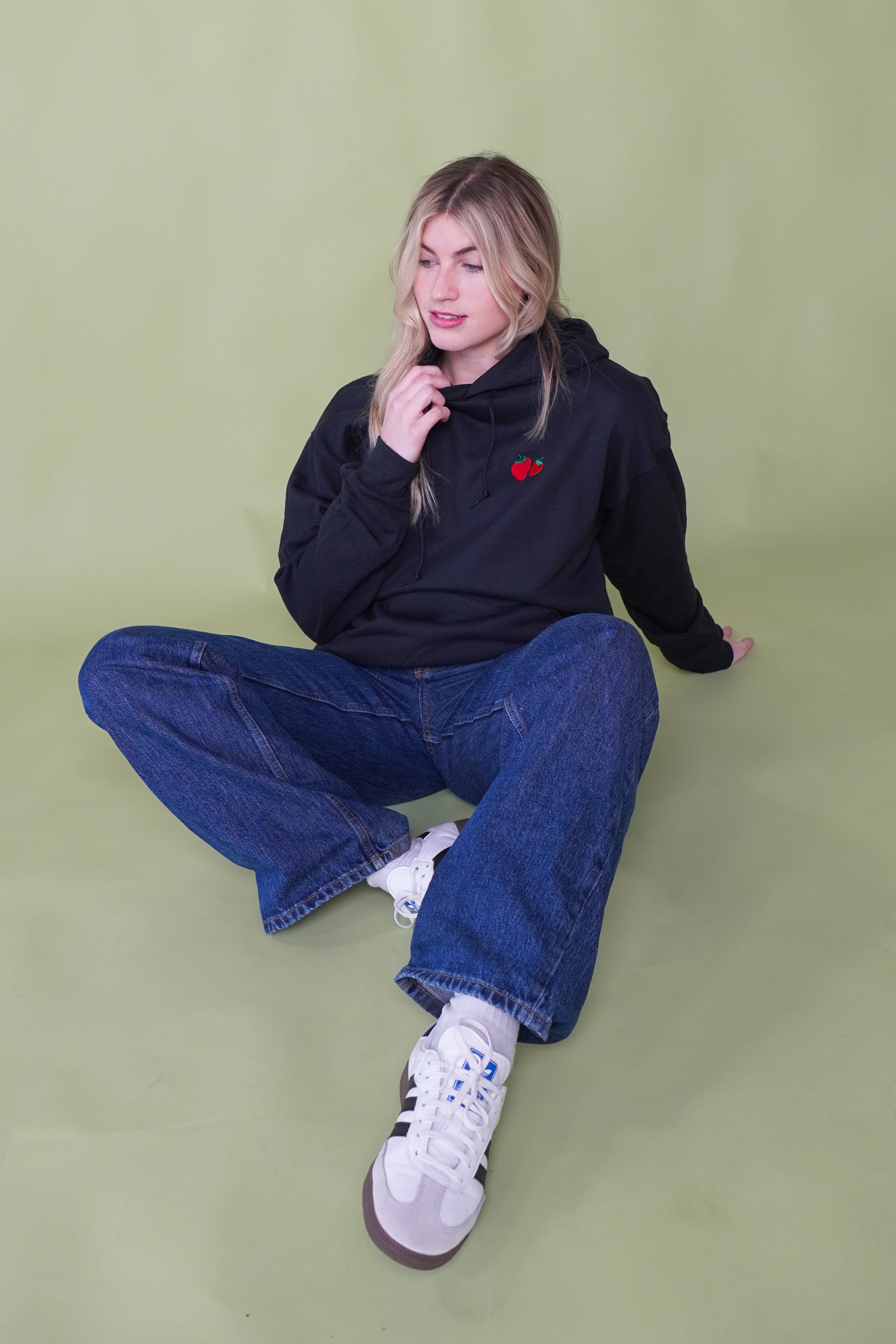 - Two embroidered strawberries on left chest with Life a Full Life printed on back
