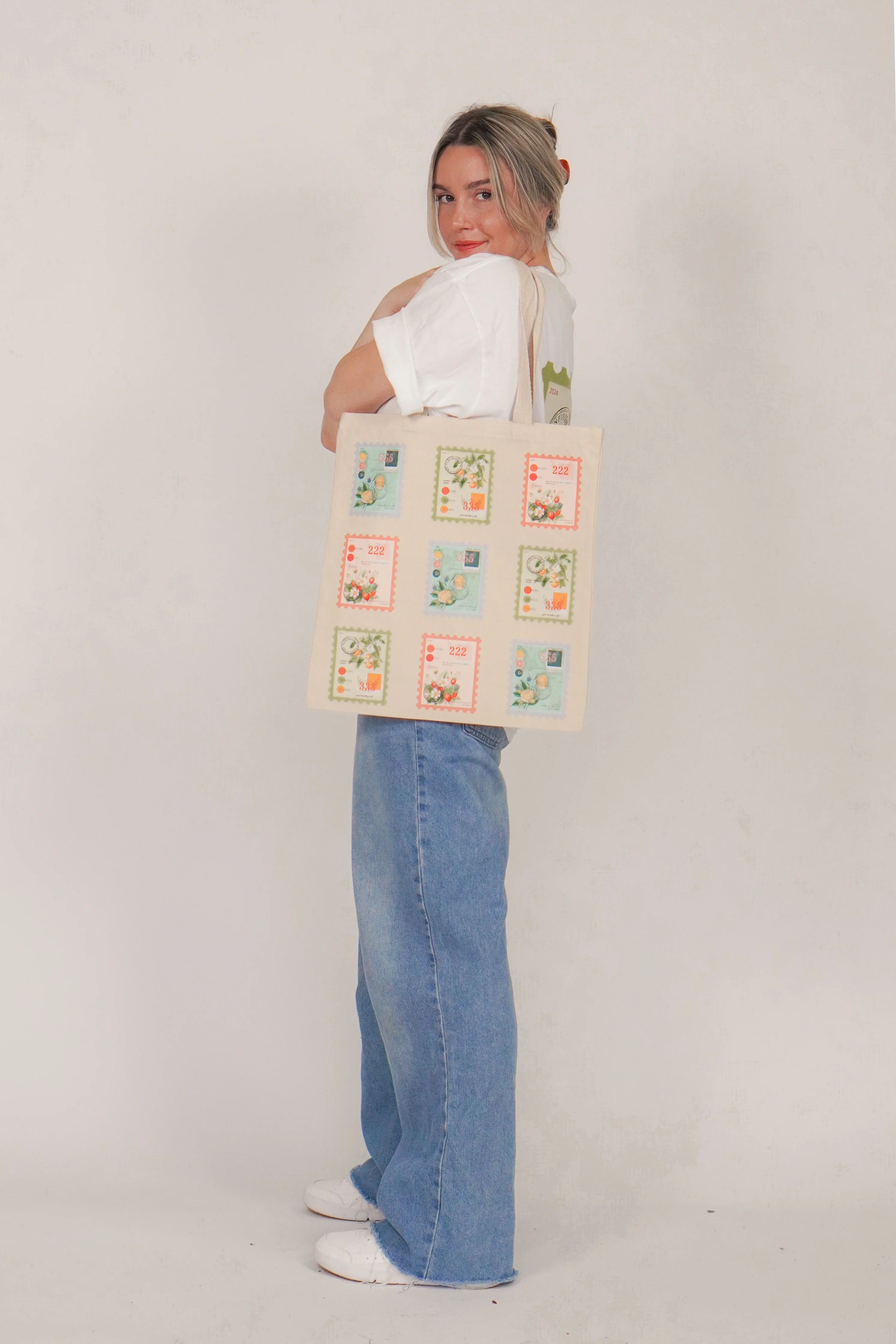 Our Origins eco-friendly tote featuring the LOVE, GRATITUDE, and HEALING Patchwork Stamp design.